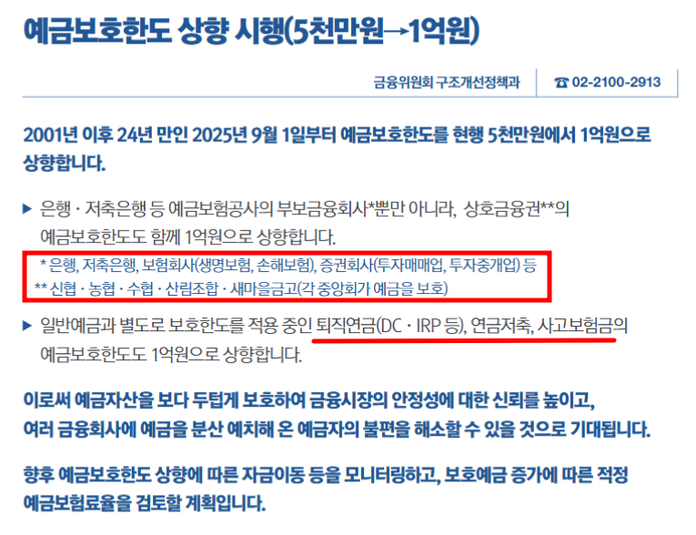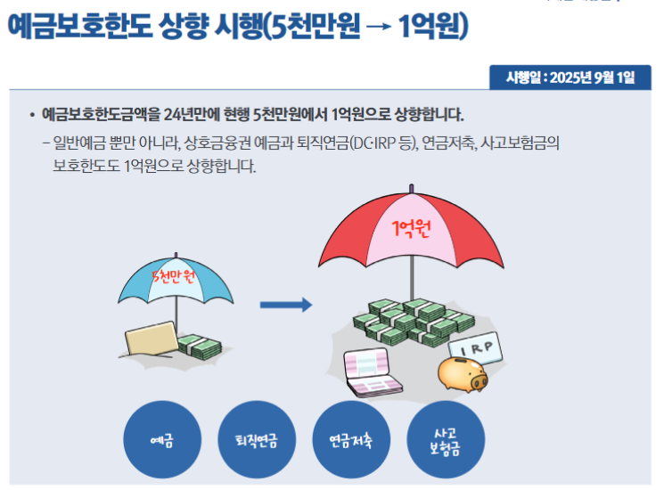 💡 즉, 모든 금융기관이 2025년 9월 1일부터 예금자 보호 한도 1억을 기준으로 예금자산을 보장해야 합니다.